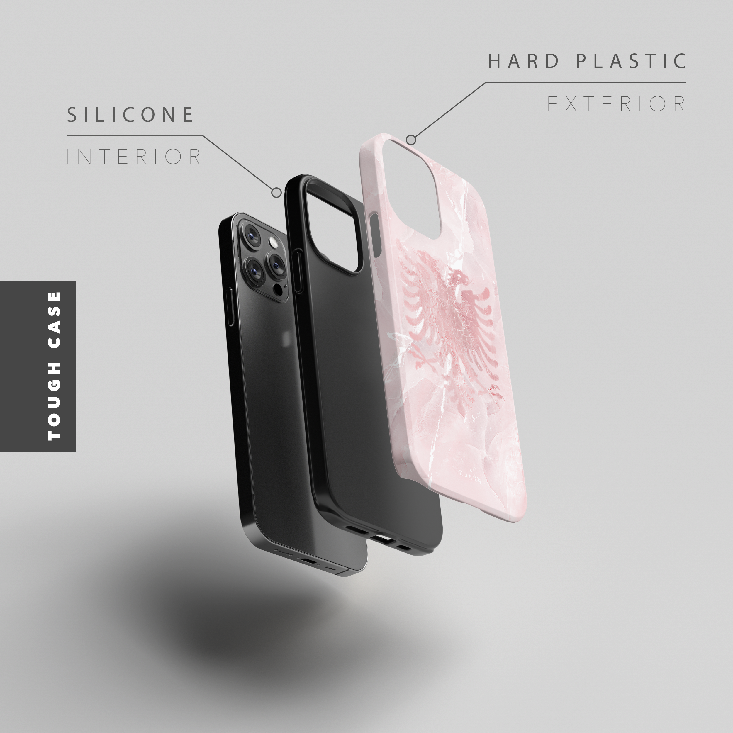Our tough phone cases feature a double-layer design: a shock-absorbent black silicone interior and a durable hard plastic shell exterior for maximum protection